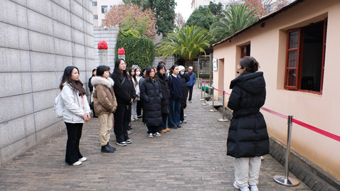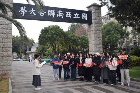 上午,学生团队抵达国立西南联大旧址,“望道微课”理论宣讲团成员田米以《守望不息:烽火岁月中的西南联大》为题,讲述1937年清华、北大、南开师生辗转迁昆办学的历史。成员们瞻仰三校校长石雕像与西南联大纪念碑,参观原教室及博物馆,深切感悟联大学子教育报国情怀与爱国民主运动历史脉络。